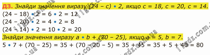 Знайди значення виразу (24 – с) • 2, якщо с = 18, с = 20, с = 14. (24 – 18) • 2 = 6 • 2 = 12 (24 – 20) • 2 = 4 • 2 = 8 (24 – 14) • 2 = 10 • 2 = 20 Знайди значення виразу а • b + (70 – 25), якщо а = 5, b = 7. 5 • 7 + (70 – 25) = 35 + (70 – 20 – 5) = 35 + 45 = 35 + 5 + 40 = 80