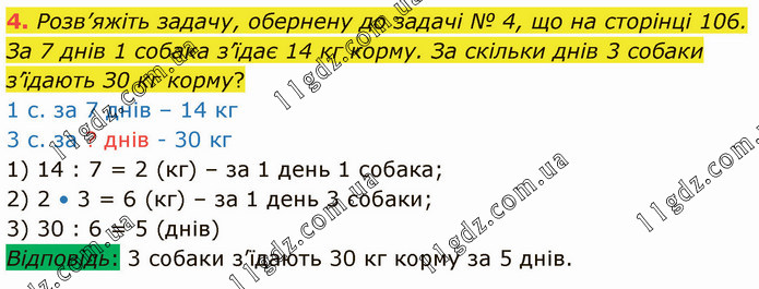 Розв’яжіть задачу, обернену до задачі № 4, що на сторінці 106. За 7 днів 1 собака з’їдає 14 кг корму. За скільки днів 3 собаки з’їдають З0 кг корму? 1 с. за 7 днів – 14 кг 3 с. за ? днів - 30 кг 1) 14 : 7 = 2 (кг) – за 1 день 1 собака; 2) 2 • 3 = 6 (кг) – за 1 день 3 собаки; 3) 30 : 6 = 5 (днів) Відповідь: 3 собаки з’їдають 30 кг корму за 5 днів.