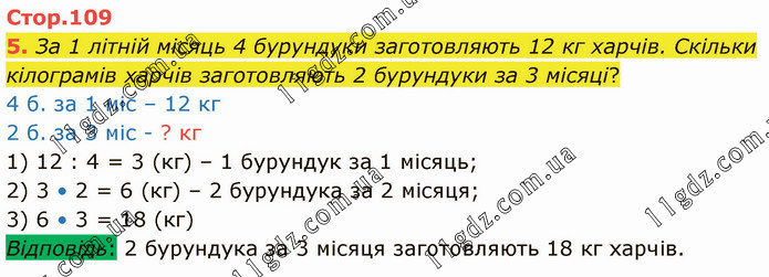 За 1 літній місяць 4 бурундуки заготовляють 12 кг харчів. Скільки кілограмів харчів заготовляють 2 бурундуки за 3 місяці? 4 б. за 1 міс – 12 кг 2 б. за 3 міс - ? кг 1) 12 : 4 = 3 (кг) – 1 бурундук за 1 місяць; 2) 3 • 2 = 6 (кг) – 2 бурундука за 2 місяця; 3) 6 • 3 = 18 (кг) Відповідь: 2 бурундука за 3 місяця заготовляють 18 кг харчів.