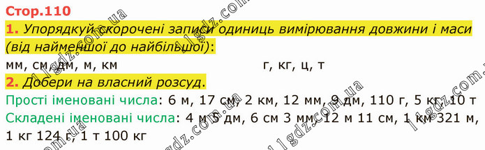Упорядкуй скорочені записи одиниць вимірювання довжини і маси (від найменшої до найбільшої): мм, см, дм, м, км г, кг, ц, т 2. Добери на власний розсуд. Прості іменовані числа: 6 м, 17 см, 2 км, 12 мм, 9 дм, 110 г, 5 кг, 10 т Складені іменовані числа: 4 м 5 дм, 6 см 3 мм, 12 м 11 см, 1 км 321 м, 1 кг 124 г, 1 т 100 кг