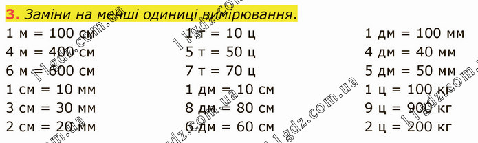Заміни на менші одиниці вимірювання. 1 м = 100 см 4 м = 400 см 6 м = 600 см 1 см = 10 мм 3 см = 30 мм 2 см = 20 мм 1 т = 10 ц 5 т = 50 ц 7 т = 70 ц 1 дм = 10 см 8 дм = 80 см 6 дм = 60 см 1 дм = 100 мм 4 дм = 40 мм 5 дм = 50 мм 1 ц = 100 кг 9 ц = 900 кг 2 ц = 200 кг