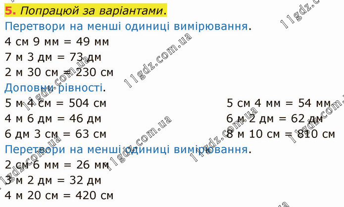 Попрацюй за варіантами. Перетвори на менші одиниці вимірювання. 4 см 9 мм = 49 мм 7 м 3 дм = 73 дм 2 м 30 см = 230 см Доповни рівності. 5 м 4 см = 504 см 4 м 6 дм = 46 дм 6 дм 3 см = 63 см 5 см 4 мм = 54 мм 6 м 2 дм = 62 дм 8 м 10 см = 810 см Перетвори на менші одиниці вимірювання. 2 см 6 мм = 26 мм 3 м 2 дм = 32 дм 4 м 20 см = 420 см