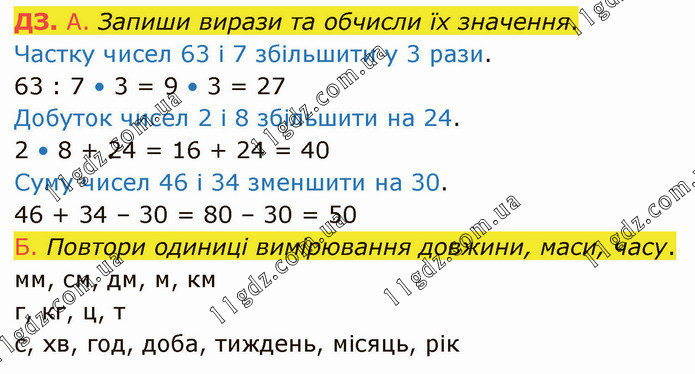 А. Запиши вирази та обчисли їх значення. Частку чисел 63 і 7 збільшити у 3 рази. 63 : 7 • 3 = 9 • 3 = 27 Добуток чисел 2 і 8 збільшити на 24. 2 • 8 + 24 = 16 + 24 = 40 Суму чисел 46 і 34 зменшити на 30. 46 + 34 – 30 = 80 – 30 = 50 Б. Повтори одиниці вимірювання довжини, маси, часу. мм, см, дм, м, км г, кг, ц, т с, хв, год, доба, тиждень, місяць, рік