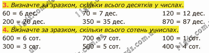 Визначте за зразком, скільки всього десятків у числах. 60 = 6 дес. 200 = 20 дес. 70 = 7 дес. 350 = 35 дес. 120 = 12 дес. 870 = 87 дес. 4. Визначте за зразком, скільки всього сотень у числах. 600 = 6 сот. 300 = 3 сот. 700 = 7 сот. 500 = 5 сот. 100 = 1 сот. 400 = 4 сот.