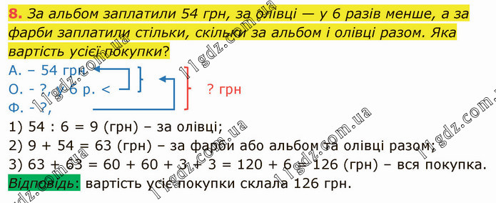 За альбом заплатили 54 грн, за олівці — у 6 разів менше, а за фарби заплатили стільки, скільки за альбом і олівці разом. Яка вартість усієї покупки? А. – 54 грн О. - ?, у 6 р. < ? грн Ф. - ?, 1) 54 : 6 = 9 (грн) – за олівці; 2) 9 + 54 = 63 (грн) – за фарби або альбом та олівці разом; 3) 63 + 63 = 60 + 60 + 3 + 3 = 120 + 6 = 126 (грн) – вся покупка. Відповідь: вартість усіє покупки склала 126 грн.