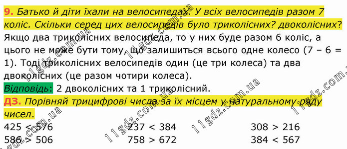 Батько й діти їхали на велосипедах. У всіх велосипедів разом 7 коліс. Скільки серед цих велосипедів було триколісних? двоколісних? Якщо два триколісних велосипеда, то у них буде разом 6 коліс, а цього не може бути тому, що залишиться всього одне колесо (7 – 6 = 1). Тоді триколісних велосипедів один (це три колеса) та два двоколісних (це разом чотири колеса). Відповідь: 2 двоколісних та 1 триколісний. ДЗ. Порівняй трицифрові числа за їх місцем у натуральному ряду чисел. 425 < 576 586 > 506 237 < 384 758 > 672 308 > 216 384 < 567