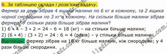 За таблицею склади і розв’яжи задачу. Фермер за день зібрав 4 ящика малини по 6 кг в кожному, та 2 ящика чорної смородини по 3 кг в кожному. На скільки більше малини зібрав фермер? У скільки разів більше зібрав малини? 1) 6 • 4 – 3 • 2 = 24 – 6 = 18 (кг) – на стільки більше малини; 2) (6 • 4) : (3 • 2) = 24 : 6 = 4 (разів) – у стільки більше малини. Відповідь: фермер зібрав на 18 кг більше малини, ніж смородини; у 4 рази більше смородини.