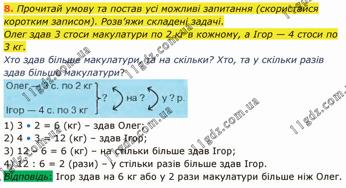 Прочитай умову та постав усі можливі запитання (скористайся коротким записом). Розв’яжи складені задачі. Олег здав 3 стоси макулатури по 2 кг в кожному, а Ігор — 4 стоси по 3 кг. Хто здав більше макулатури, та на скільки? Хто, та у скільки разів здав більше макулатури? 1) 3 • 2 = 6 (кг) – здав Олег; 2) 4 • 3 = 12 (кг) – здав Ігор; 3) 12 – 6 = 6 (кг) – на стільки більше здав Ігор; 4) 12 : 6 = 2 (рази) – у стільки разів більше здав Ігор. Відповідь: Ігор здав на 6 кг або у 2 рази макулатури більше ніж Олег.
