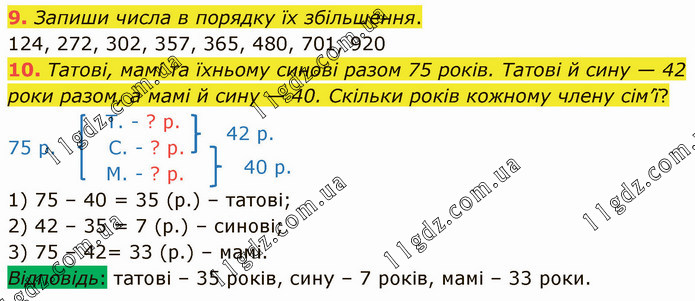 Запиши числа в порядку їх збільшення. 124, 272, 302, 357, 365, 480, 701, 920 10. Татові, мамі та їхньому синові разом 75 років. Татові й сину — 42 роки разом, а мамі й сину — 40. Скільки років кожному члену сім’ї? Т. - ? р. 75 р. С. - ? р. М. - ? р. 1) 75 – 40 = 35 (р.) – татові; 2) 42 – 35 = 7 (р.) – синові; 3) 75 – 42= 33 (р.) – мамі. Відповідь: татові – 35 років, сину – 7 років, мамі – 33 роки.