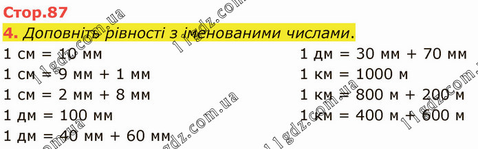 Доповніть рівності з іменованими числами. 1 см = 10 мм 1 см = 9 мм + 1 мм 1 см = 2 мм + 8 мм 1 дм = 100 мм 1 дм = 40 мм + 60 мм 1 дм = 30 мм + 70 мм 1 км = 1000 м 1 км = 800 м + 200 м 1 км = 400 м + 600 м