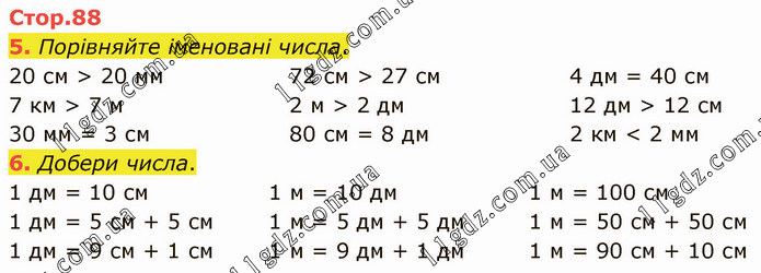 Порівняйте іменовані числа. 20 см > 20 мм 7 км > 7 м 30 мм = 3 см 72 см > 27 см 2 м > 2 дм 80 см = 8 дм 4 дм = 40 см 12 дм > 12 см 2 км < 2 мм 6. Добери числа. 1 дм = 10 см 1 дм = 5 см + 5 см 1 дм = 9 см + 1 см 1 м = 10 дм 1 м = 5 дм + 5 дм 1 м = 9 дм + 1 дм 1 м = 100 см 1 м = 50 см + 50 см 1 м = 90 см + 10 см