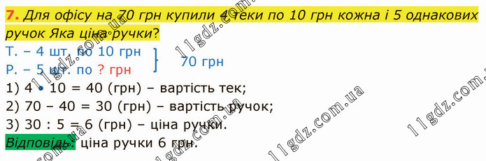 Для офісу на 70 грн купили 4 теки по 10 грн кожна і 5 однакових ручок Яка ціна ручки? Т. – 4 шт. по 10 грн Р. – 5 шт. по ? грн 1) 4 • 10 = 40 (грн) – вартість тек; 2) 70 – 40 = 30 (грн) – вартість ручок; 3) 30 : 5 = 6 (грн) – ціна ручки. Відповідь: ціна ручки 6 грн.