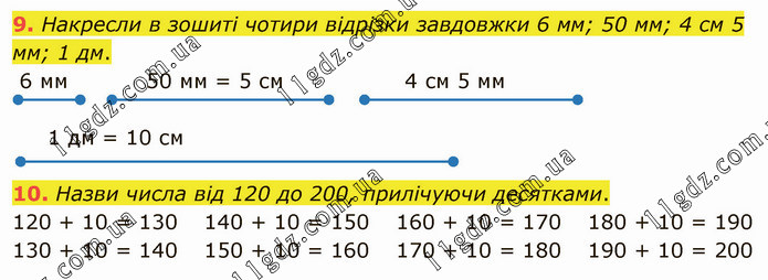 Накресли в зошиті чотири відрізки завдовжки 6 мм; 50 мм; 4 см 5 мм; 1 дм. Назви числа від 120 до 200, прилічуючи десятками. 120 + 10 = 130 130 + 10 = 140 140 + 10 = 150 150 + 10 = 160 160 + 10 = 170 170 + 10 = 180 180 + 10 = 190 190 + 10 = 200
