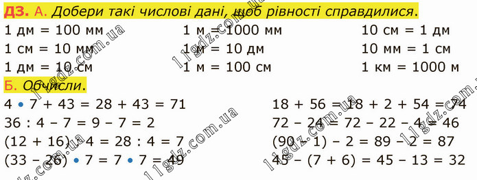 А. Добери такі числові дані, щоб рівності справдилися. 1 дм = 100 мм 1 см = 10 мм 1 дм = 10 см 1 м = 1000 мм 1 м = 10 дм 1 м = 100 см 10 см = 1 дм 10 мм = 1 см 1 км = 1000 м Б. Обчисли. 4 • 7 + 43 = 28 + 43 = 71 36 : 4 – 7 = 9 – 7 = 2 (12 + 16) : 4 = 28 : 4 = 7 (33 – 26) • 7 = 7 • 7 = 49 18 + 56 = 18 + 2 + 54 = 74 72 – 24 = 72 – 22 – 4 = 46 (90 – 1) – 2 = 89 – 2 = 87 45 – (7 + 6) = 45 – 13 = 32