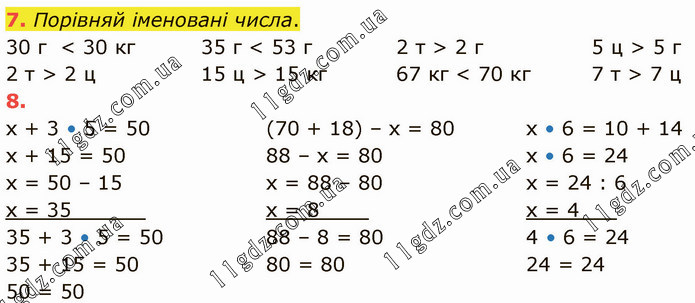 Порівняй іменовані числа. 30 г < 30 кг 2 т > 2 ц 35 г < 53 г 15 ц > 15 кг 2 т > 2 г 67 кг < 70 кг 5 ц > 5 г 7 т > 7 ц 8. х + 3 • 5 = 50 х + 15 = 50 х = 50 – 15 х = 35______ 35 + 3 • 5 = 50 35 + 15 = 50 50 = 50 (70 + 18) – х = 80 88 – х = 80 х = 88 – 80 х = 8____ 88 – 8 = 80 80 = 80 х • 6 = 10 + 14 х • 6 = 24 х = 24 : 6 х = 4___ 4 • 6 = 24 24 = 24