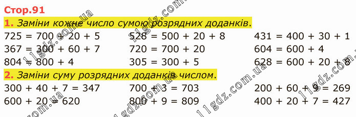 Заміни кожне число сумою розрядних доданків. 725 = 700 + 20 + 5 367 = 300 + 60 + 7 804 = 800 + 4 528 = 500 + 20 + 8 720 = 700 + 20 305 = 300 + 5 431 = 400 + 30 + 1 604 = 600 + 4 628 = 600 + 20 + 8 2. Заміни суму розрядних доданків числом. 300 + 40 + 7 = 347 600 + 20 = 620 700 + 3 = 703 800 + 9 = 809 200 + 60 + 9 = 269 400 + 20 + 7 = 427