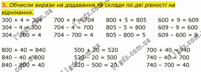 Обчисли вирази на додавання та склади по дві рівності на віднімання. 300 + 4 = 304 304 – 4 = 300 304 – 300 = 4 700 + 4 = 704 704 – 4 = 700 704 – 700 = 4 800 + 5 = 805 805 – 5 = 800 805 – 800 = 5 600 + 9 = 609 609 – 9 = 600 609 – 600 = 9 800 + 40 = 840 840 – 40 = 800 840 – 800 = 40 500 + 20 = 520 520 – 20 = 500 520 – 500 = 20 700 + 40 = 740 740 – 40 = 700 740 – 700 = 40
