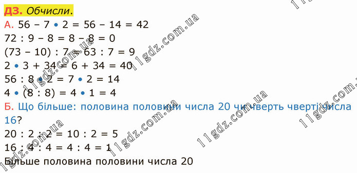 Обчисли. А. 56 – 7 • 2 = 56 – 14 = 42 72 : 9 – 8 = 8 – 8 = 0 (73 – 10) : 7 = 63 : 7 = 9 2 • 3 + 34 = 6 + 34 = 40 56 : 8 • 2 = 7 • 2 = 14 4 • (8 : 8) = 4 • 1 = 4 Б. Що більше: половина половини числа 20 чи чверть чверті числа 16? 20 : 2 : 2 = 10 : 2 = 5 16 : 4 : 4 = 4 : 4 = 1 Більше половина половини числа 20