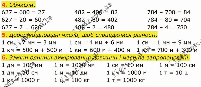 Обчисли. 627 – 600 = 27 627 – 20 = 607 627 – 7 = 620 482 – 400 = 82 482 – 80 = 402 482 – 2 = 480 784 – 700 = 84 784 – 80 = 704 784 – 4 = 780 5. Добери відповідні числа, щоб справдилися рівності. 1 см = 7 мм + 3 мм 1 км = 500 м + 500 м 1 см = 4 мм + 6 мм 1 км = 600 м + 400 м 1 см = 1 мм + 9 мм 1 км = 700 м + 300 м 6. Заміни одиниці вимірювання довжини і маси на запропоновані. 1 дм = 100 мм 1 дм = 10 см 1 кг = 1000 г 1 м = 1000 мм 1 м = 10 дм 1 ц = 100 кг 1 см = 10 мм 1 км = 1000 м 1 т = 1000 кг