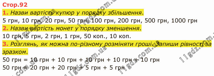 Назви вартість купюр у порядку збільшення. 5 грн, 10 грн, 20 грн, 50 грн, 100 грн, 200 грн, 500 грн, 1000 грн 2. Назви вартість монет у порядку зменшення. 10 грн, 5 грн, 2 грн, 1 грн, 50 коп., 10 коп. 3. Розглянь, як можна по-різному розміняти гроші. Запиши рівності за зразком. 50 грн = 10 грн + 10 грн + 10 грн + 10 грн + 10 грн 50 грн = 20 грн + 20 грн + 5 грн + 5 грн
