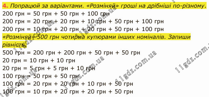 Попрацюй за варіантами. «Розміняй» гроші на дрібніші по-різному. 200 грн = 50 грн + 50 грн + 100 грн 200 грн = 20 грн + 20 грн + 10 грн + 50 грн + 100 грн 200 грн = 10 грн + 20 грн + 20 грн + 50 грн + 100 грн «Розміняй» 500 грн чотирма купюрами інших номіналів. Запиши рівність. 500 грн = 200 грн + 200 грн + 50 грн + 50 грн 20 грн = 10 грн + 10 грн 20 грн = 5 грн + 5 грн + 10 грн 100 грн = 50 грн + 50 грн 100 грн = 20 грн + 20 грн + 10 грн + 50 грн 100 грн = 10 грн + 20 грн + 20 грн + 50 грн