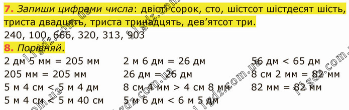 Запиши цифрами числа: двісті сорок, сто, шістсот шістдесят шість, триста двадцять, триста тринадцять, дев’ятсот три. 240, 100, 666, 320, 313, 903 8. Порівняй. 2 дм 5 мм = 205 мм 205 мм = 205 мм 5 м 4 см < 5 м 4 дм 5 м 4 см < 5 м 40 см 2 м 6 дм = 26 дм 26 дм = 26 дм 8 см 4 мм > 4 см 8 мм 5 м 6 дм < 6 м 5 дм 56 дм < 65 дм 8 см 2 мм = 82 мм 82 мм = 82 мм