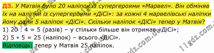 У Матвія було 20 наліпок із супергероями «Марвел». Він обміняв їх на наліпки із супергероями «ДіСі»: за кожні 4 марвелівські наліпки йому дали 5 наліпок «ДіСі». Скільки наліпок «ДіСі» тепер у Матвія? 1) 20 : 4 = 5 (разів) – у стільки більше він отримав «ДіСі»; 2) 5 • 5 = 25 (наліпок) – всього «ДіСі». Відповідь: тепер у Матвія 25 наліпок.