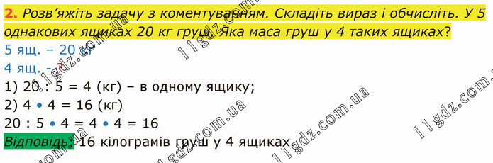 Розв’яжіть задачу з коментуванням. Складіть вираз і обчисліть. У 5 однакових ящиках 20 кг груш. Яка маса груш у 4 таких ящиках? 5 ящ. – 20 кг 4 ящ. - ? 1) 20 : 5 = 4 (кг) – в одному ящику; 2) 4 • 4 = 16 (кг) 20 : 5 • 4 = 4 • 4 = 16 Відповідь: 16 кілограмів груш у 4 ящиках.