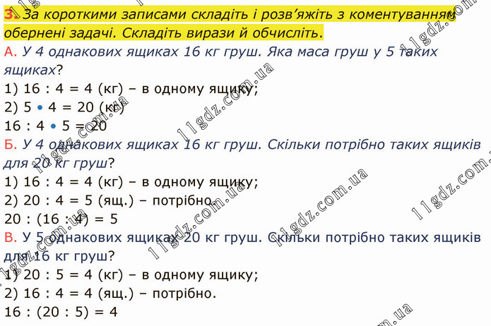 За короткими записами складіть і розв’яжіть з коментуванням обернені задачі. Складіть вирази й обчисліть. А. У 4 однакових ящиках 16 кг груш. Яка маса груш у 5 таких ящиках? 1) 16 : 4 = 4 (кг) – в одному ящику; 2) 5 • 4 = 20 (кг) 16 : 4 • 5 = 20 Б. У 4 однакових ящиках 16 кг груш. Скільки потрібно таких ящиків для 20 кг груш? 1) 16 : 4 = 4 (кг) – в одному ящику; 2) 20 : 4 = 5 (ящ.) – потрібно. 20 : (16 : 4) = 5 В. У 5 однакових ящиках 20 кг груш. Скільки потрібно таких ящиків для 16 кг груш? 1) 20 : 5 = 4 (кг) – в одному ящику; 2) 16 : 4 = 4 (ящ.) – потрібно. 16 : (20 : 5) = 4