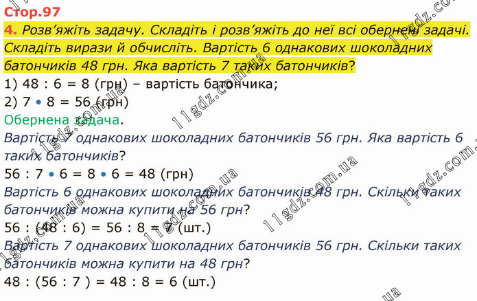 Розв’яжіть задачу. Складіть і розв’яжіть до неї всі обернені задачі. Складіть вирази й обчисліть. Вартість 6 однакових шоколадних батончиків 48 грн. Яка вартість 7 таких батончиків? 1) 48 : 6 = 8 (грн) – вартість батончика; 2) 7 • 8 = 56 (грн) Обернена задача. Вартість 7 однакових шоколадних батончиків 56 грн. Яка вартість 6 таких батончиків? 56 : 7 • 6 = 8 • 6 = 48 (грн) Вартість 6 однакових шоколадних батончиків 48 грн. Скільки таких батончиків можна купити на 56 грн? 56 : (48 : 6) = 56 : 8 = 7 (шт.) Вартість 7 однакових шоколадних батончиків 56 грн. Скільки таких батончиків можна купити на 48 грн? 48 : (56 : 7 ) = 48 : 8 = 6 (шт.)