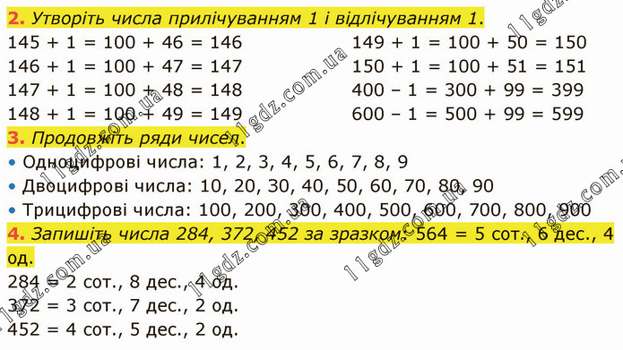 Утворіть числа прилічуванням 1 і відлічуванням 1. 145 + 1 = 100 + 46 = 146 146 + 1 = 100 + 47 = 147 147 + 1 = 100 + 48 = 148 148 + 1 = 100 + 49 = 149 149 + 1 = 100 + 50 = 150 150 + 1 = 100 + 51 = 151 400 – 1 = 300 + 99 = 399 600 – 1 = 500 + 99 = 599 3. Продовжіть ряди чисел. • Одноцифрові числа: 1, 2, 3, 4, 5, 6, 7, 8, 9 • Двоцифрові числа: 10, 20, З0, 40, 50, 60, 70, 80, 90 • Трицифрові числа: 100, 200, 300, 400, 500, 600, 700, 800, 900 4. Запишіть числа 284, 372, 452 за зразком: 564 = 5 сот., 6 дес., 4 од. 284 = 2 сот., 8 дес., 4 од. 372 = 3 сот., 7 дес., 2 од. 452 = 4 сот., 5 дес., 2 од.