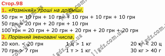 «Розміняй» гроші на дрібніші. 50 грн = 10 грн + 10 грн + 10 грн + 10 грн + 10 грн 50 грн = 20 грн + 20 грн + 10 грн 100 грн = 20 грн + 20 грн + 20 грн + 20 грн + 20 грн 2. Порівняй іменовані числа. 20 коп. < 20 грн 70 грн > 7 грн 1 ц > 1 кг 1 т > 1 кг 20 кг < 20 ц 30 кг > 40 г