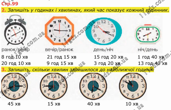Запишіть у годинах і хвилинах, який час показує кожний годинник. 8 год 10 хв 21 год 15 хв 15 год 20 хв 1 год 40 хв 20 год 10 хв 9 год 15 хв 3 год 20 хв 13 год 40 хв 3. Запишіть, скільки хвилин залишилося до найближчої години. 45 хв 15 хв 40 хв 10 хв