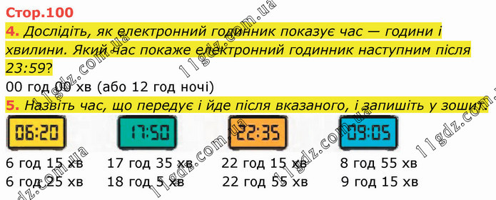 Дослідіть, як електронний годинник показує час — години і хвилини. Який час покаже електронний годинник наступним після 23:59? 00 год 00 хв (або 12 год ночі) 5. Назвіть час, що передує і йде після вказаного, і запишіть у зошит. 6 год 15 хв 17 год 35 хв 22 год 15 хв 8 год 55 хв 6 год 25 хв 18 год 5 хв 22 год 55 хв 9 год 15 хв