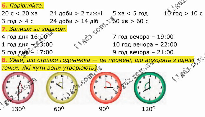 Порівняйте. 20 с < 20 хв 3 год > 4 с 24 доби > 2 тижні 24 доби > 14 діб 5 хв < 5 год 60 хв > 60 с 10 год > 10 с 7. Запиши за зразком. 4 год дня 16:00 1 год дня – 13:00 5 год дня – 17:00 7 год вечора – 19:00 10 год вечора – 22:00 9 год вечора – 21:00 8. Уяви, що стрілки годинника — це промені, що виходять з однієї точки. Які кути вони утворюють? 130О 60О 90О 120О