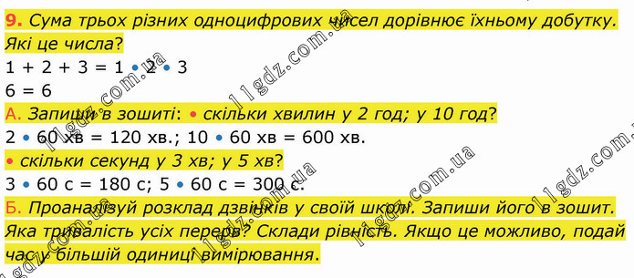 Сума трьох різних одноцифрових чисел дорівнює їхньому добутку. Які це числа? 1 + 2 + 3 = 1 • 2 • 3 6 = 6 А. Запиши в зошиті: • скільки хвилин у 2 год; у 10 год? 2 • 60 хв = 120 хв.; 10 • 60 хв = 600 хв. • скільки секунд у 3 хв; у 5 хв? 3 • 60 с = 180 с; 5 • 60 с = 300 с. Б. Проаналізуй розклад дзвінків у своїй школі. Запиши його в зошит. Яка тривалість усіх перерв? Склади рівність. Якщо це можливо, подай час у більшій одиниці вимірювання.