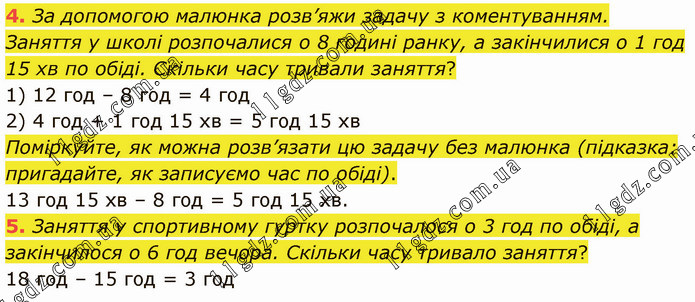 За допомогою малюнка розв’яжи задачу з коментуванням. Заняття у школі розпочалися о 8 годині ранку, а закінчилися о 1 год 15 хв по обіді. Скільки часу тривали заняття? 1) 12 год – 8 год = 4 год 2) 4 год + 1 год 15 хв = 5 год 15 хв Поміркуйте, як можна розв’язати цю задачу без малюнка (підказка: пригадайте, як записуємо час по обіді). 13 год 15 хв – 8 год = 5 год 15 хв. 5. Заняття у спортивному гуртку розпочалося о 3 год по обіді, а закінчилося о 6 год вечора. Скільки часу тривало заняття? 18 год – 15 год = 3 год