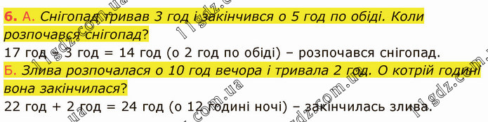А. Снігопад тривав 3 год і закінчився о 5 год по обіді. Коли розпочався снігопад? 17 год – 3 год = 14 год (о 2 год по обіді) – розпочався снігопад. Б. Злива розпочалася о 10 год вечора і тривала 2 год. О котрій годині вона закінчилася? 22 год + 2 год = 24 год (о 12 годині ночі) – закінчилась злива.