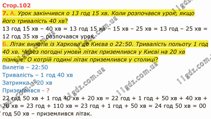А. Урок закінчився о 13 год 15 хв. Коли розпочався урок, якщо його тривалість 40 хв? 13 год 15 хв – 40 хв = 13 год 15 хв – 15 хв – 25 хв = 13 год – 25 хв = 12 год 35 хв – розпочався урок. Б. Літак вилетів із Харкова до Києва о 22:50. Тривалість польоту 1 год 40 хв. Через погодні умови літак приземлився у Києві на 20 хв пізніше. О котрій годині літак приземлився у столиці? Вилетів – 22:50 Тривалість – 1 год 40 хв Затримка – 20 хв Приземлився - ? 22 год 50 хв + 1 год 40 хв + 20 хв = 22 год + 1 год + 50 хв + 40 хв + 20 хв = 23 год + 110 хв = 23 год + 1 год + 50 хв = 24 год 50 хв = 00 год 50 хв – приземлився літак.