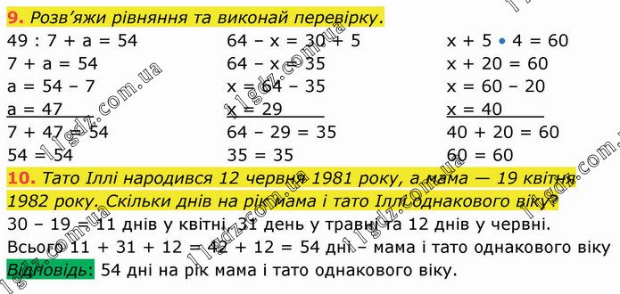 Розв’яжи рівняння та виконай перевірку. 49 : 7 + а = 54 7 + а = 54 а = 54 – 7 а = 47___ 7 + 47 = 54 54 = 54 64 – х = 30 + 5 64 – х = 35 х = 64 – 35 х = 29____ 64 – 29 = 35 35 = 35 х + 5 • 4 = 60 х + 20 = 60 х = 60 – 20 х = 40____ 40 + 20 = 60 60 = 60 10. Тато Іллі народився 12 червня 1981 року, а мама — 19 квітня 1982 року. Скільки днів на рік мама і тато Іллі однакового віку? 30 – 19 = 11 днів у квітні, 31 день у травні та 12 днів у червні. Всього 11 + 31 + 12 = 42 + 12 = 54 дні – мама і тато однакового віку Відповідь: 54 дні на рік мама і тато однакового віку.