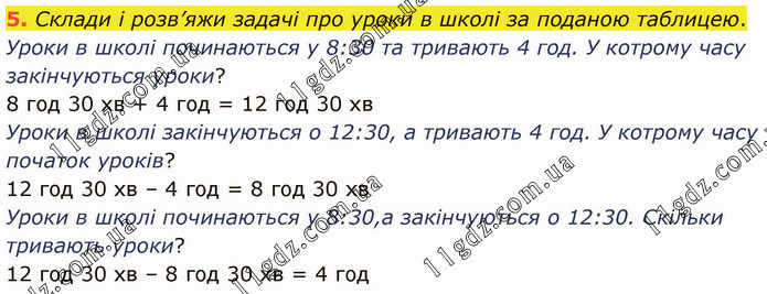 Склади і розв’яжи задачі про уроки в школі за поданою таблицею. Уроки в школі починаються у 8:30 та тривають 4 год. У котрому часу закінчуються уроки? 8 год 30 хв + 4 год = 12 год 30 хв Уроки в школі закінчуються о 12:30, а тривають 4 год. У котрому часу початок уроків? 12 год 30 хв – 4 год = 8 год 30 хв Уроки в школі починаються у 8:30,а закінчуються о 12:30. Скільки тривають уроки? 12 год 30 хв – 8 год 30 хв = 4 год