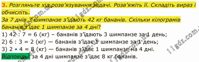 Розгляньте хід розв’язування задачі. Розв’яжіть її. Складіть вираз і обчисліть. За 7 днів 3 шимпанзе з’їдають 42 кг бананів. Скільки кілограмів бананів з’їдає 1 шимпанзе за 4 дні? 1) 42 : 7 = 6 (кг) – бананів з’їдають 3 шимпанзе за 1 день; 2) 6 : 3 = 2 (кг) — бананів з’їдає 1 шимпанзе за 1 день; 3) 2 • 4 = 8 (кг) — бананів з’їдає 1 шимпанзе на 4 дні. Відповідь: за 4 дні шимпанзе з’їдає 8 кг бананів.