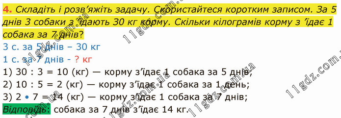 Складіть і розв’яжіть задачу. Скористайтеся коротким записом. За 5 днів 3 собаки з ’їдають З0 кг корму. Скільки кілограмів корму з ’їдає 1 собака за 7 днів? 3 с. за 5 днів – 30 кг 1 с. за 7 днів - ? кг 1) 30 : 3 = 10 (кг) — корму з’їдає 1 собака за 5 днів; 2) 10 : 5 = 2 (кг) — корму з’їдає 1 собака за 1 день; 3) 2 • 7 = 14 (кг) — корму з’їдає 1 собака за 7 днів; Відповідь: собака за 7 днів з’їдає 14 кг.