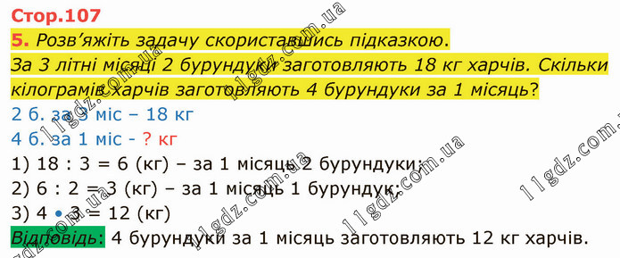 Розв’яжіть задачу скориставшись підказкою. За 3 літні місяці 2 бурундуки заготовляють 18 кг харчів. Скільки кілограмів харчів заготовляють 4 бурундуки за 1 місяць? 2 б. за 3 міс – 18 кг 4 б. за 1 міс - ? кг 1) 18 : 3 = 6 (кг) – за 1 місяць 2 бурундуки; 2) 6 : 2 = 3 (кг) – за 1 місяць 1 бурундук; 3) 4 • 3 = 12 (кг) Відповідь: 4 бурундуки за 1 місяць заготовляють 12 кг харчів.
