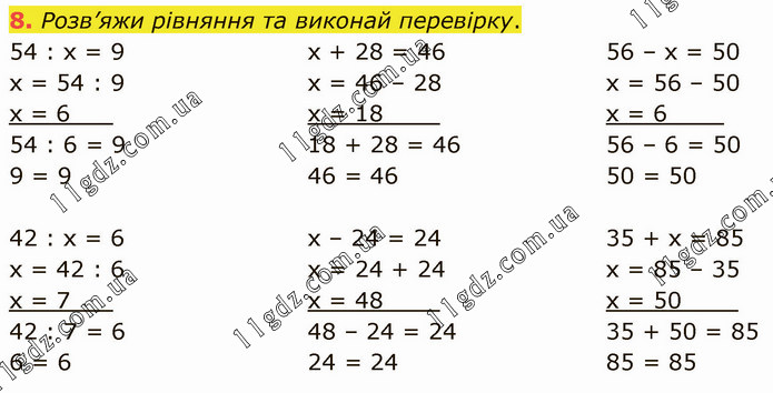 Розв’яжи рівняння та виконай перевірку. 54 : х = 9 х = 54 : 9 х = 6___ 54 : 6 = 9 9 = 9 х + 28 = 46 х = 46 – 28 х = 18____ 18 + 28 = 46 46 = 46 56 – х = 50 х = 56 – 50 х = 6____ 56 – 6 = 50 50 = 50 42 : х = 6 х = 42 : 6 х = 7___ 42 : 7 = 6 6 = 6 х – 24 = 24 х = 24 + 24 х = 48____ 48 – 24 = 24 24 = 24 35 + х = 85 х = 85 – 35 х = 50____ 35 + 50 = 85 85 = 85