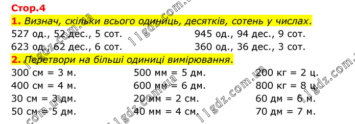 1. Визнач, скільки всього одиниць, десятків, сотень у числах. 527 од., 52 дес., 5 сот. 623 од., 62 дес., 6 сот. 945 од., 94 дес., 9 сот. 360 од., 36 дес., 3 сот. 2. Перетвори на більші одиниці вимірювання. 300 см = 3 м. 400 см = 4 м. 500 мм = 5 дм. 600 мм = 6 дм. 200 кг = 2 ц. 800 кг = 8 ц. 30 см = 3 дм. 50 см = 5 дм. 20 мм = 2 см. 40 мм = 4 см. 60 дм = 6 м. 70 дм = 7 м.