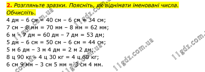Розгляньте зразки. Поясніть, як віднімати іменовані числа. Обчисліть. 4 дм – 6 см = 40 см – 6 см = 34 см; 7 см – 8 мм = 70 мм – 8 мм = 62 мм; 6 м – 7 дм = 60 дм – 7 дм = 53 дм; 5 дм – 6 см = 50 см – 6 см = 44 см; 5 м 6 дм – 3 м 4 дм = 2 м 2 дм; 8 ц 90 кг – 4 ц 30 кг = 4 ц 60 кг; 6 см 9 мм – 3 см 5 мм = 3 см 4 мм.