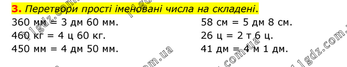 Перетвори прості іменовані числа на складені. 360 мм = 3 дм 60 мм. 460 кг = 4 ц 60 кг. 450 мм = 4 дм 50 мм. 58 см = 5 дм 8 см. 26 ц = 2 т 6 ц. 41 дм = 4 м 1 дм.