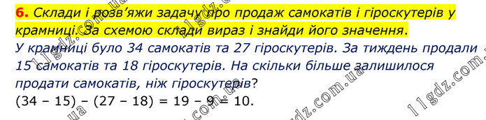 Склади і розв’яжи задачу про продаж самокатів і гіроскутерів у крамниці. За схемою склади вираз і знайди його значення. У крамниці було 34 самокатів та 27 гіроскутерів. За тиждень продали 15 самокатів та 18 гіроскутерів. На скільки більше залишилося продати самокатів, ніж гіроскутерів? (34 – 15) – (27 – 18) = 19 – 9 = 10.
