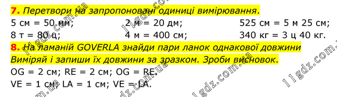 7. Перетвори на запропоновані одиниці вимірювання. 5 см = 50 мм; 8 т = 80 ц; 2 м = 20 дм; 4 м = 400 см; 525 см = 5 м 25 см; 340 кг = 3 ц 40 кг. 8. На ламаній GOVERLA знайди пари ланок однакової довжини Виміряй і запиши їх довжини за зразком. Зроби висновок. OG = 2 см; RE = 2 см; OG = RE. VE = 1 см; LA = 1 см; VE = LA.